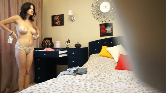 Przebieranki pięknej brunetki przy włączonej kamerce
